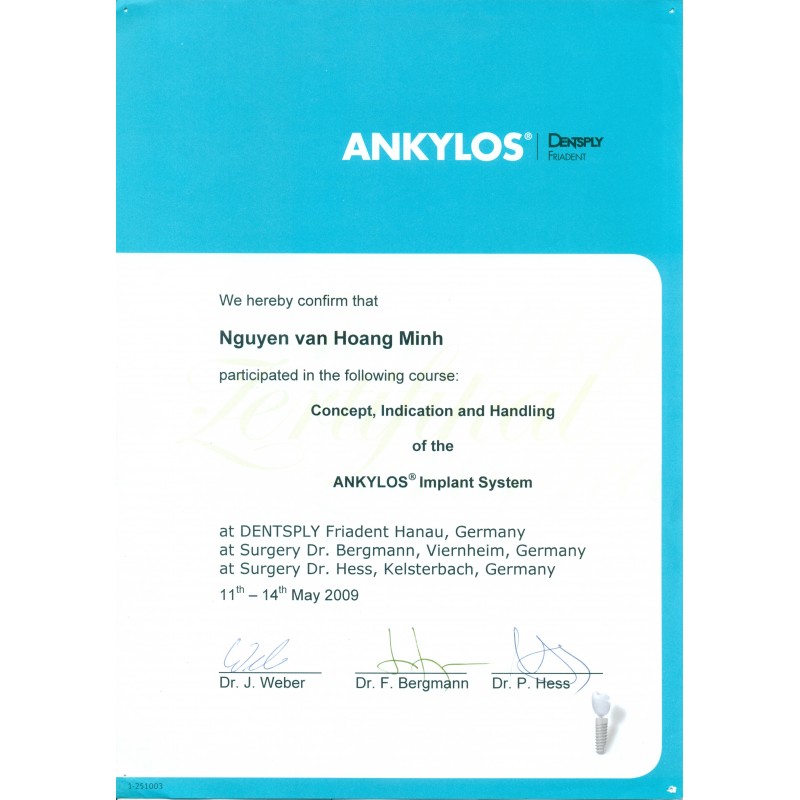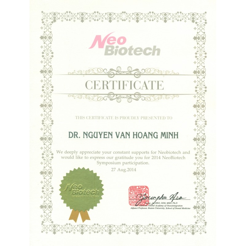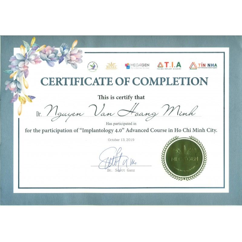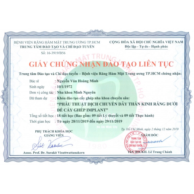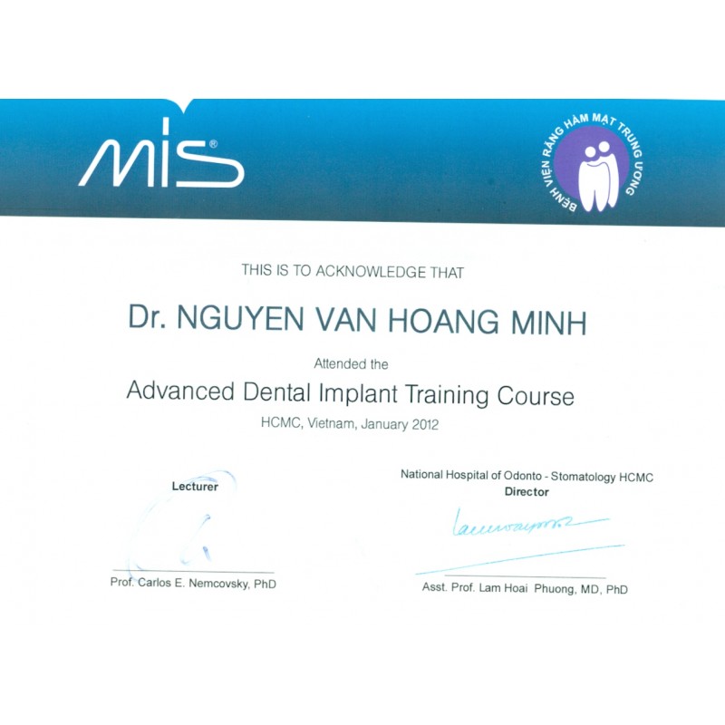 Bác sĩ Nguyễn Văn Hoàng Minh là người sáng lập ra Nha khoa Minh Nguyên. Là thành viên hiệp hội Implant thế giới ICOI (International Congress of Oral Implantologists thành lập từ năm 1972 tại Hoa Kì), Bác sĩ Nguyễn Văn Hoàng Minh đã tu nghiệp các nước Mỹ, Pháp, Đức,Thụy Sĩ, Hàn Quốc… và có hơn 25 năm kinh nghiệm chuyên cấy ghép Implant và chỉnh hình răng thẩm mỹ.