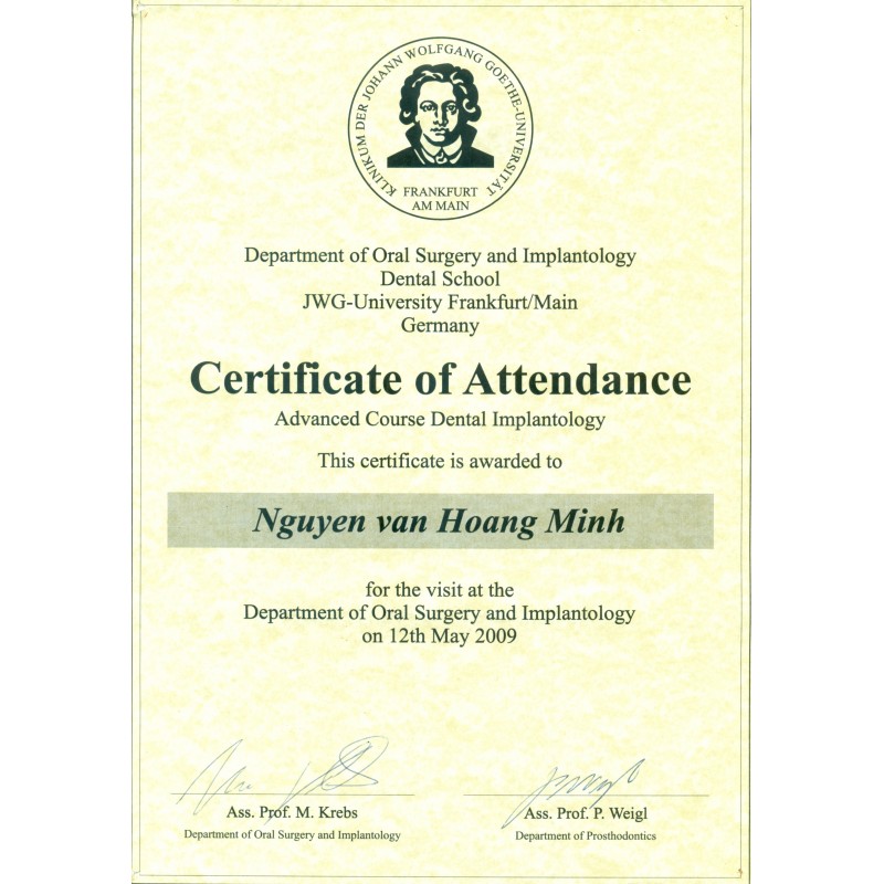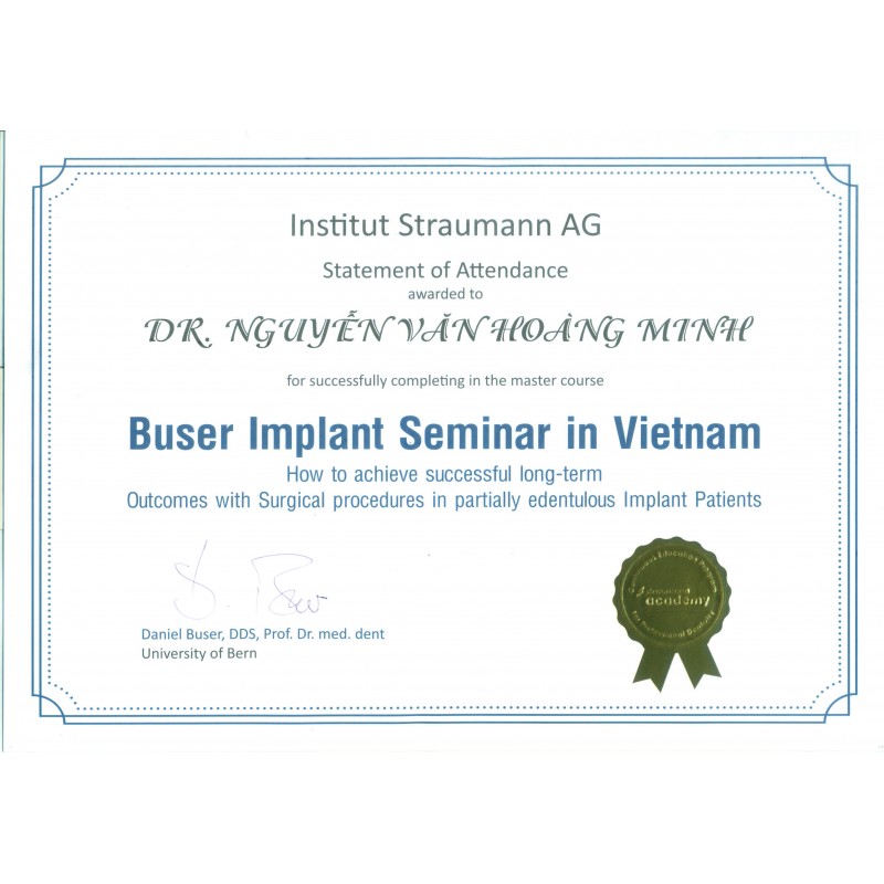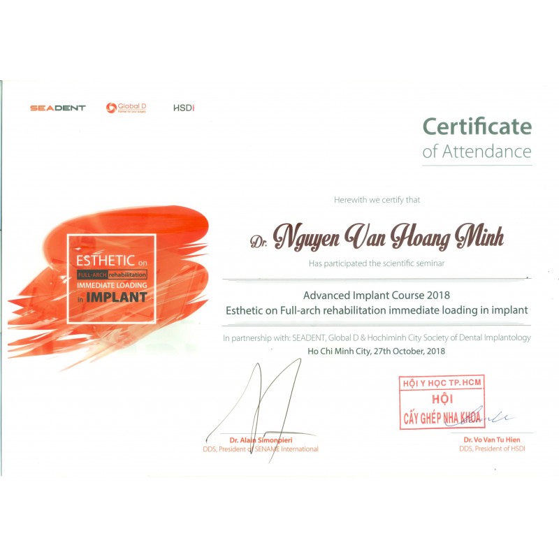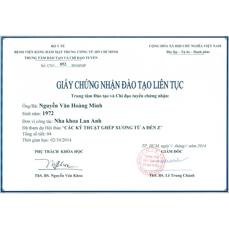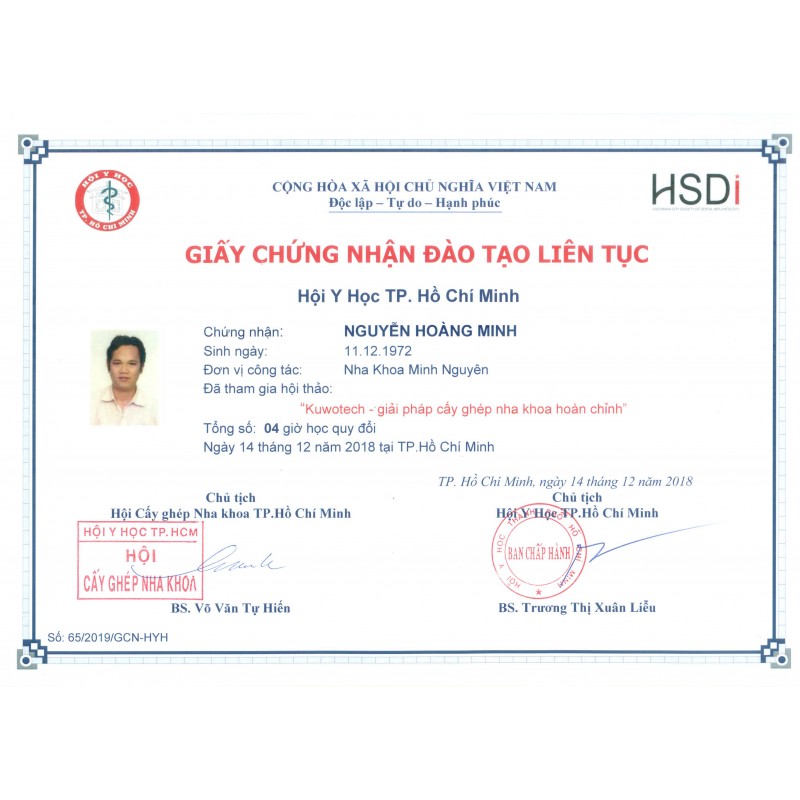 Bác sĩ Nguyễn Văn Hoàng Minh là người sáng lập ra Nha khoa Minh Nguyên. Là thành viên hiệp hội Implant thế giới ICOI (International Congress of Oral Implantologists thành lập từ năm 1972 tại Hoa Kì), Bác sĩ Nguyễn Văn Hoàng Minh đã tu nghiệp các nước Mỹ, Pháp, Đức,Thụy Sĩ, Hàn Quốc… và có hơn 25 năm kinh nghiệm chuyên cấy ghép Implant và chỉnh hình răng thẩm mỹ.